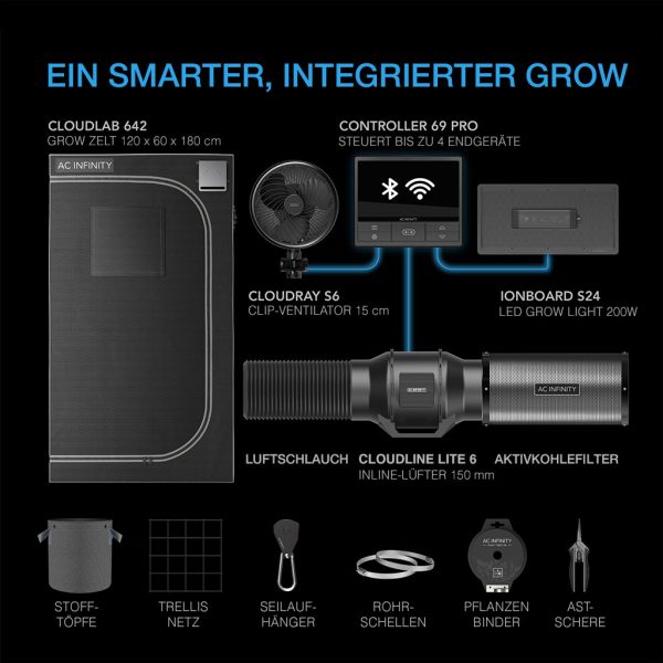 Der CONTROLLER 69 PRO ist das Herzstück dieses Systems und ermöglicht die zentrale oder unabhängige Steuerung aller Geräte. Mit dynamischen Programmen kannst du das Dampfdruckdefizit (VPD), die Temperatur und die Luftfeuchtigkeit überwachen und deine Geräte automatisch anpassen. Die Timer-, Zyklus- und Zeitplan-Modi bieten zusätzliche Flexibilität für eine präzise Steuerung. Über die AC Infinity App kannst du dein Grow-System sicher per WiFi steuern –egal, wo du dich
